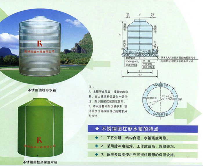 5、保溫不銹鋼圓柱水箱制作精良、用途廣泛 精密摸具液壓拉伸成型,可廣泛應用于賓館、公寓、商場、休閑等場所的冷熱水箱,并可用作食品、醫(yī)療、環(huán)保、化工等行業(yè)的貯液容器。